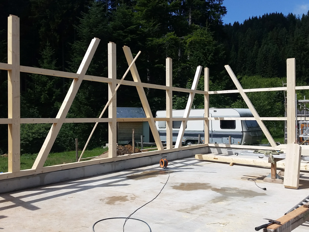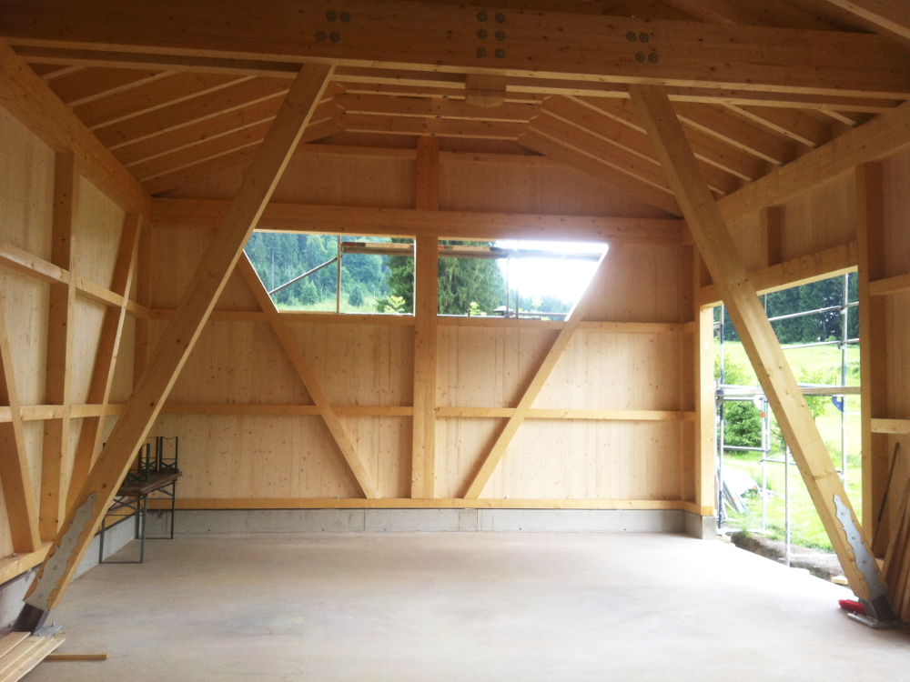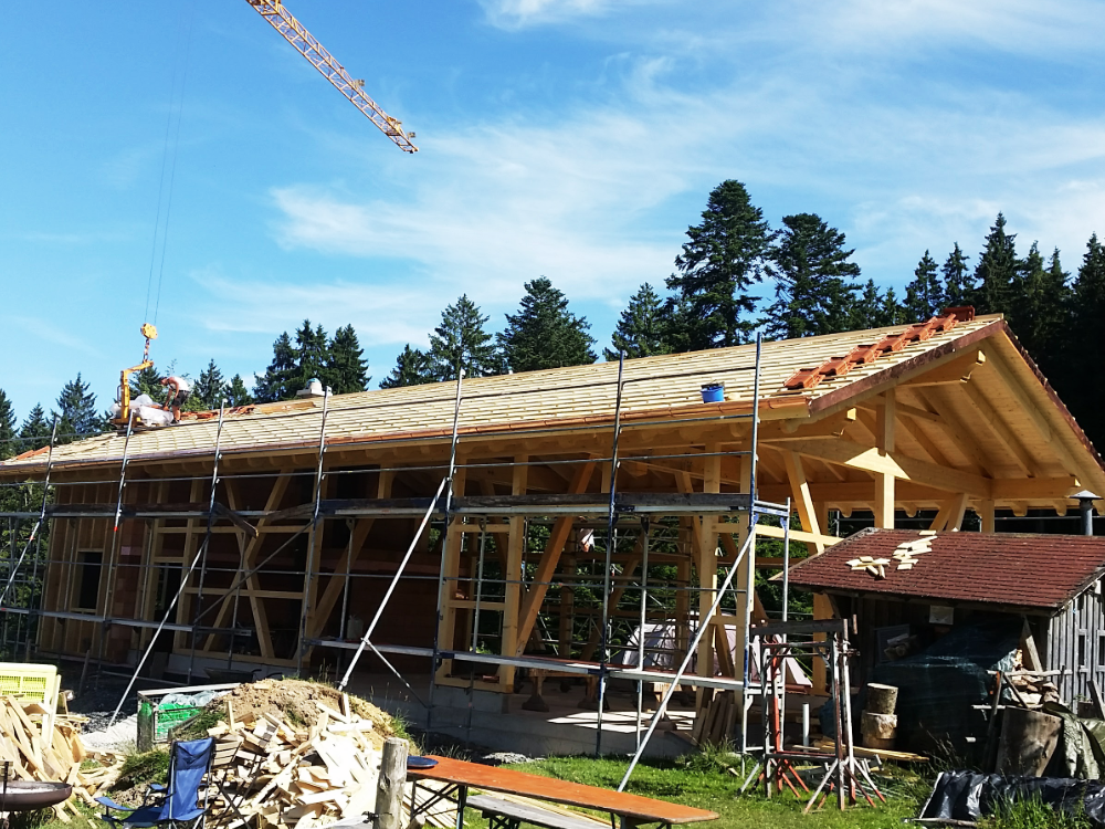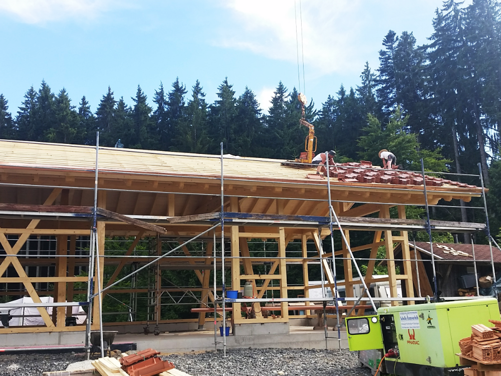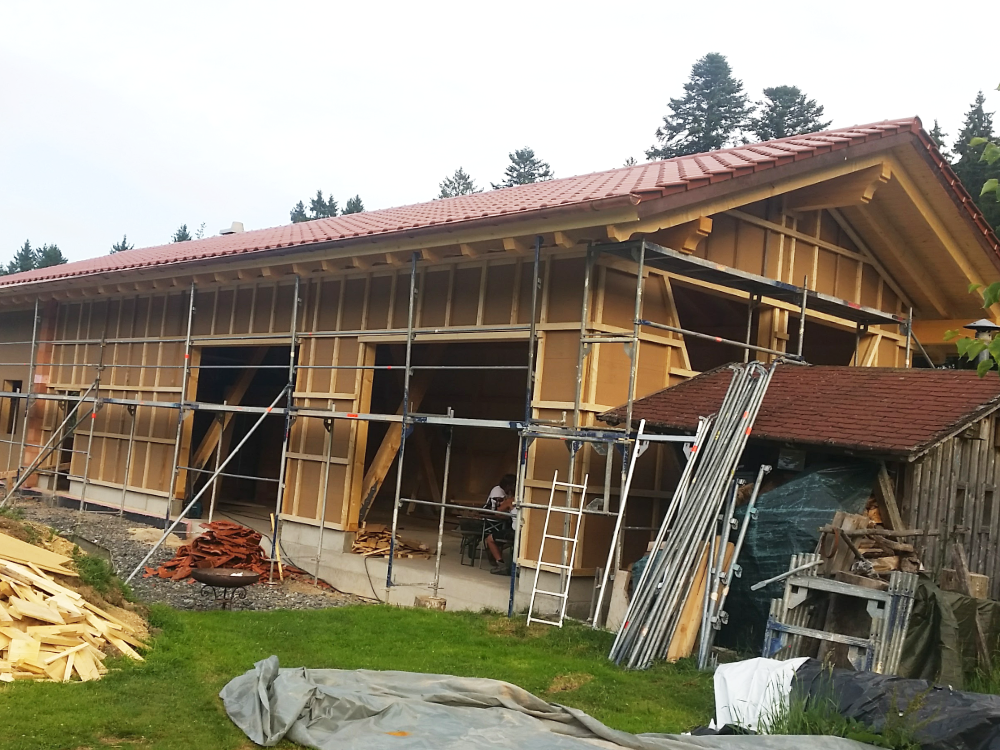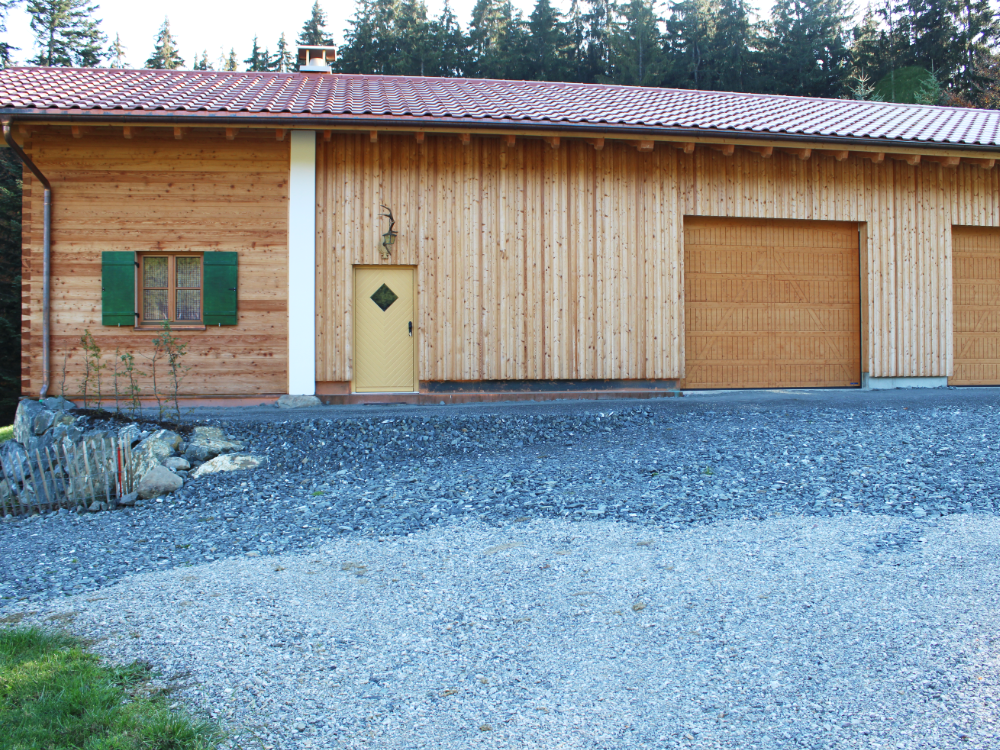 mit Aufenhaltsaum, Sanitärbereich und Lagerplatz. Kombination aus Holzständer und traditionellem Fachwerkbau. Außenverkleidung aus gehackter Blockwandschalung in heimischer Lärche und Bodendeckelschalung aus sibirischer Lärche.