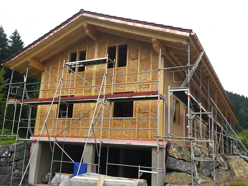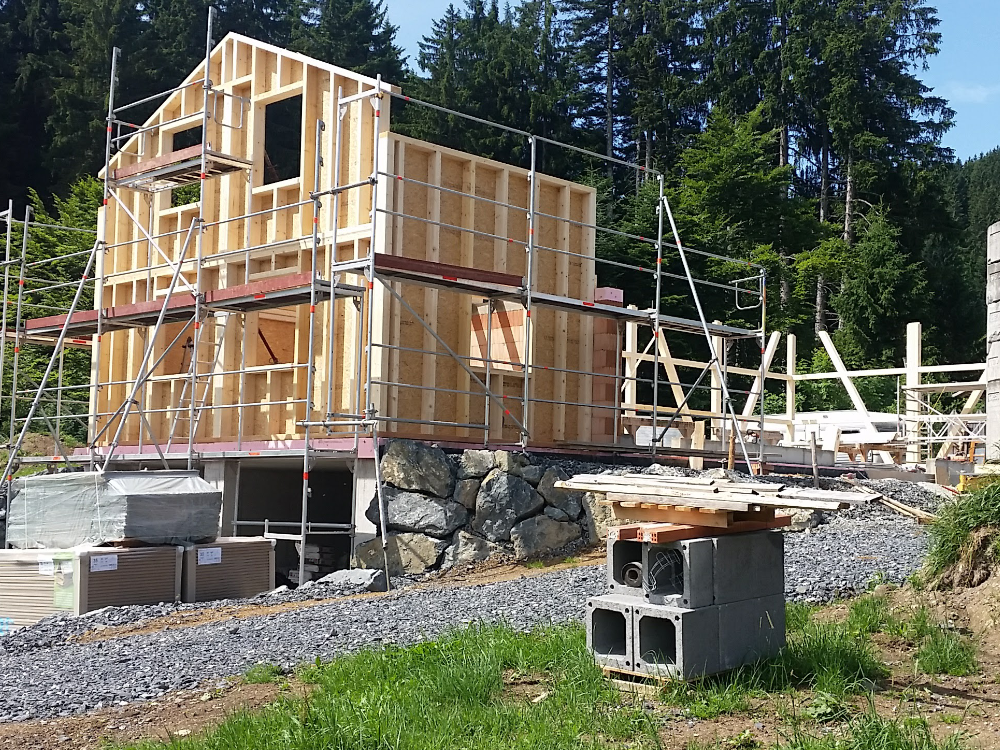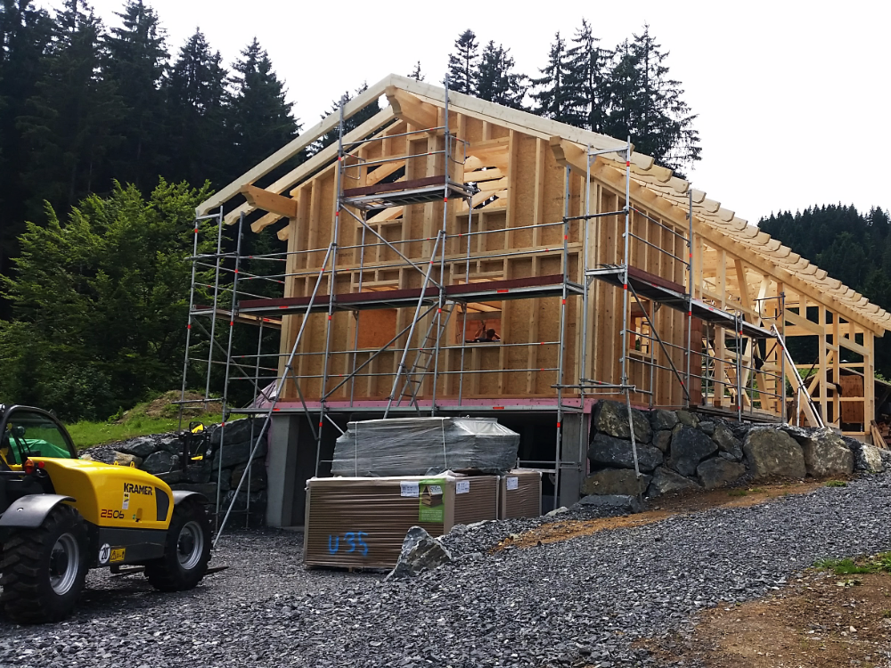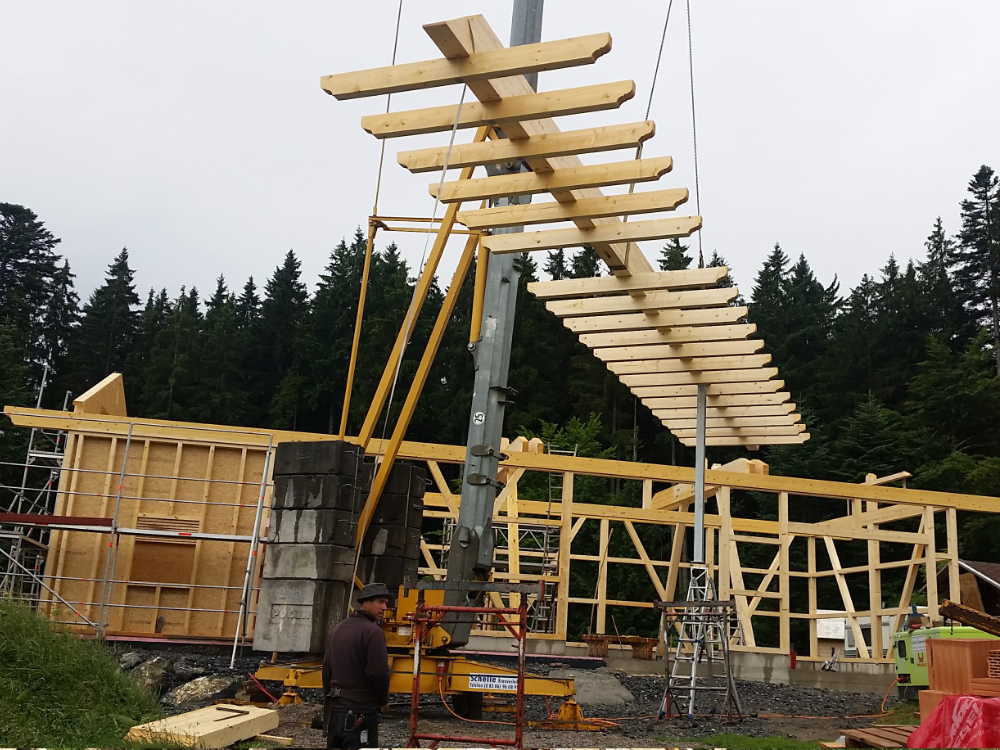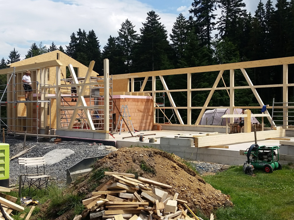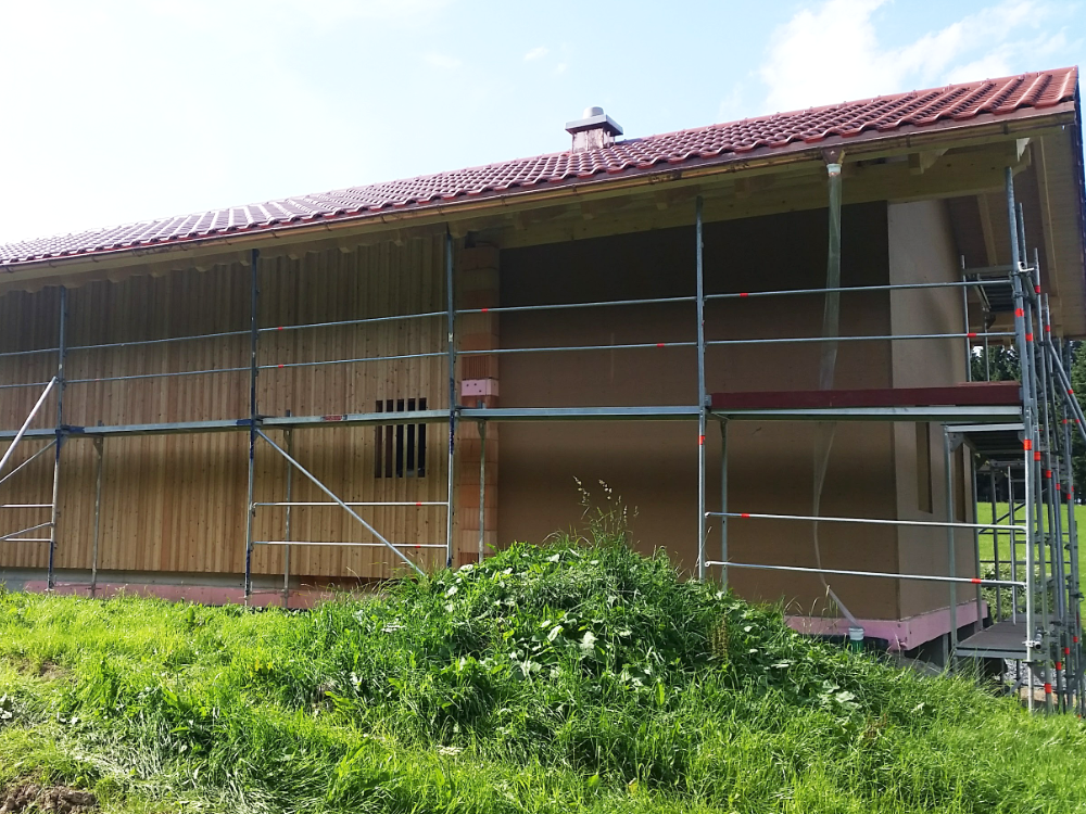 mit Aufenhaltsaum, Sanitärbereich und Lagerplatz. Kombination aus Holzständer und traditionellem Fachwerkbau. Außenverkleidung aus gehackter Blockwandschalung in heimischer Lärche und Bodendeckelschalung aus sibirischer Lärche.