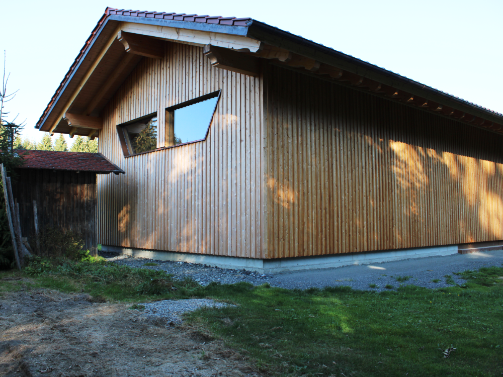 mit Aufenhaltsaum, Sanitärbereich und Lagerplatz. Kombination aus Holzständer und traditionellem Fachwerkbau. Außenverkleidung aus gehackter Blockwandschalung in heimischer Lärche und Bodendeckelschalung aus sibirischer Lärche.